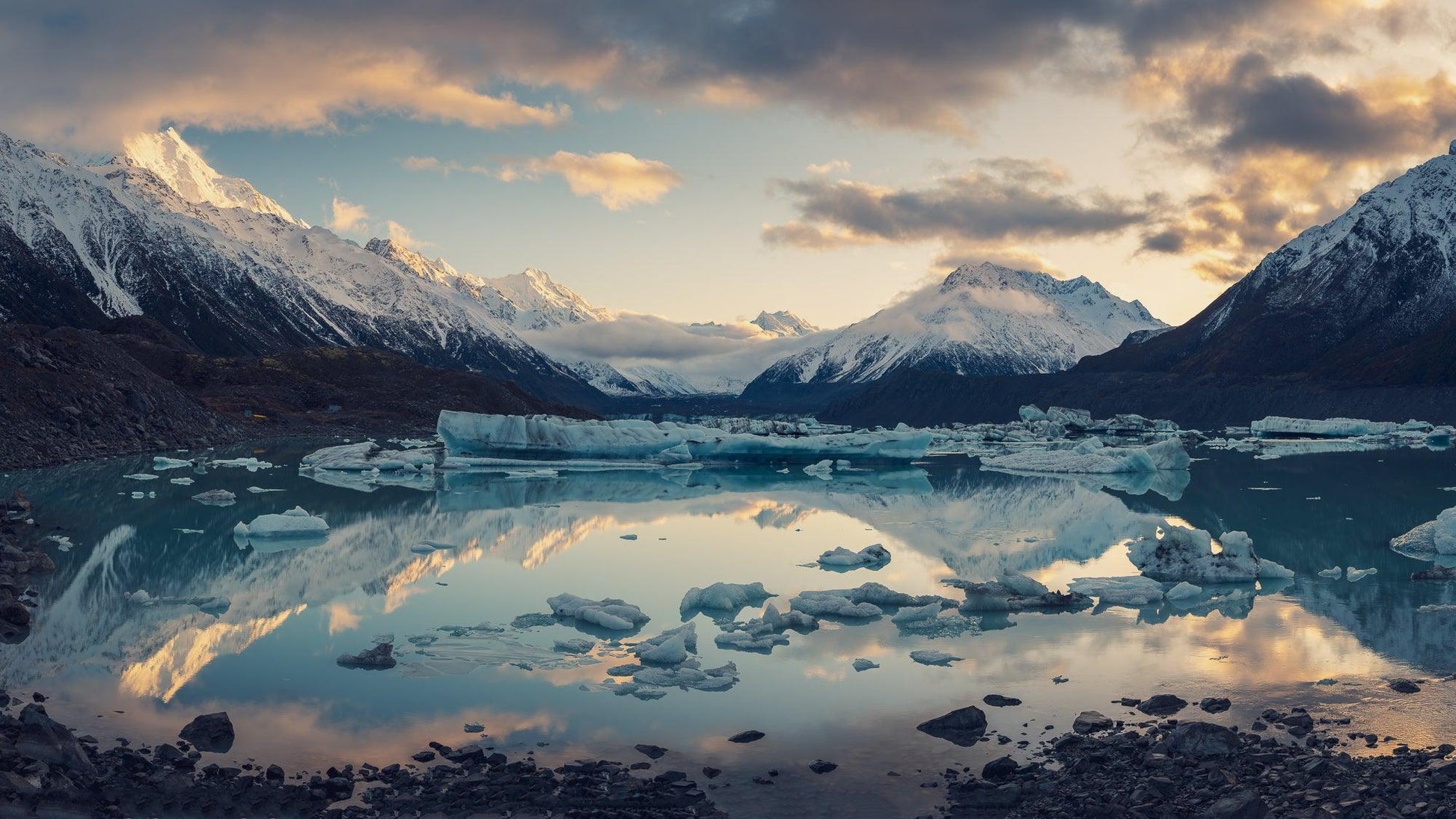 Stephen Milner's "Aurora of Aoraki" captures the ethereal beauty of dawn at Tasman Glacier Lake. Morning light bathes the majestic peaks of Aoraki (Mt Cook) and Tasman in a soft glow, casting reflections on the still water. Icebergs float serenely, creating a scene of tranquility in the heart of Mount Cook National Park.