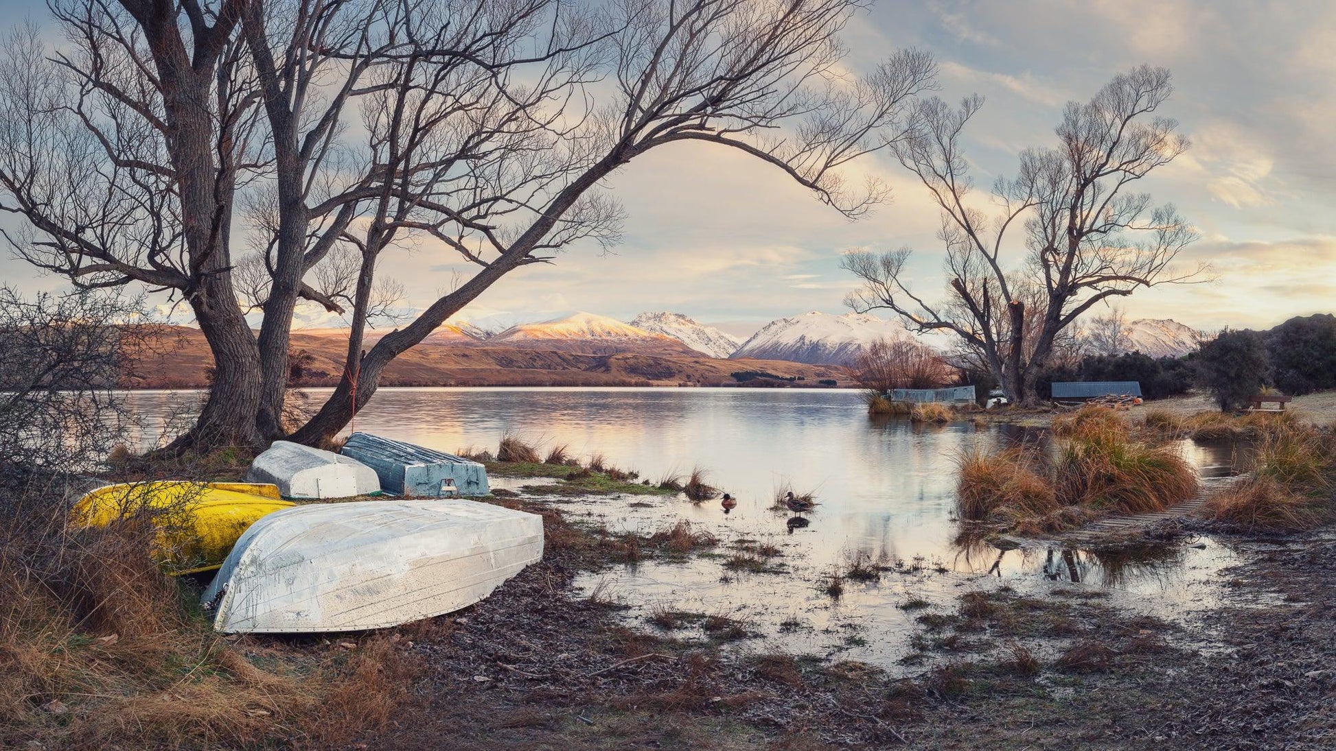 This captivating image by Stephen Milner captures a sunrise at Lake Alexandrina. Rowing boats rest under trees, framing a view of the snow-capped Haszard Range reflected in the calm water.
